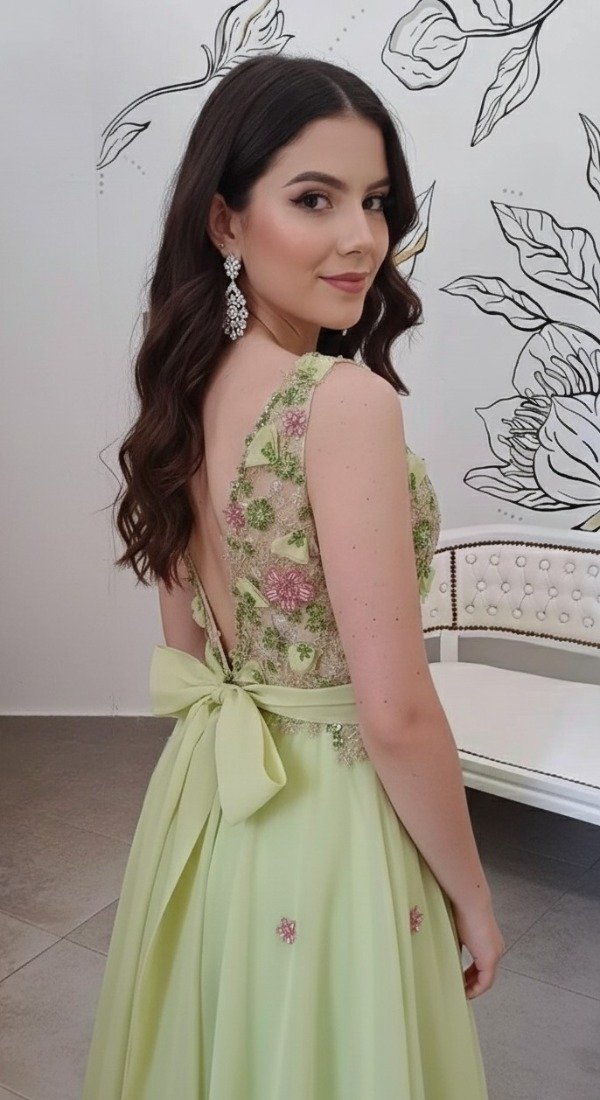 Vestido en Organza con detalle de volado en falda y lazo de moño.