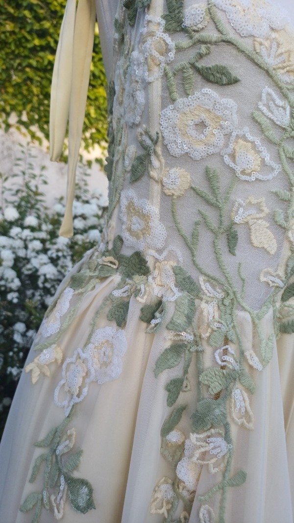 Totalmente bordado a mano en un tul pintado.