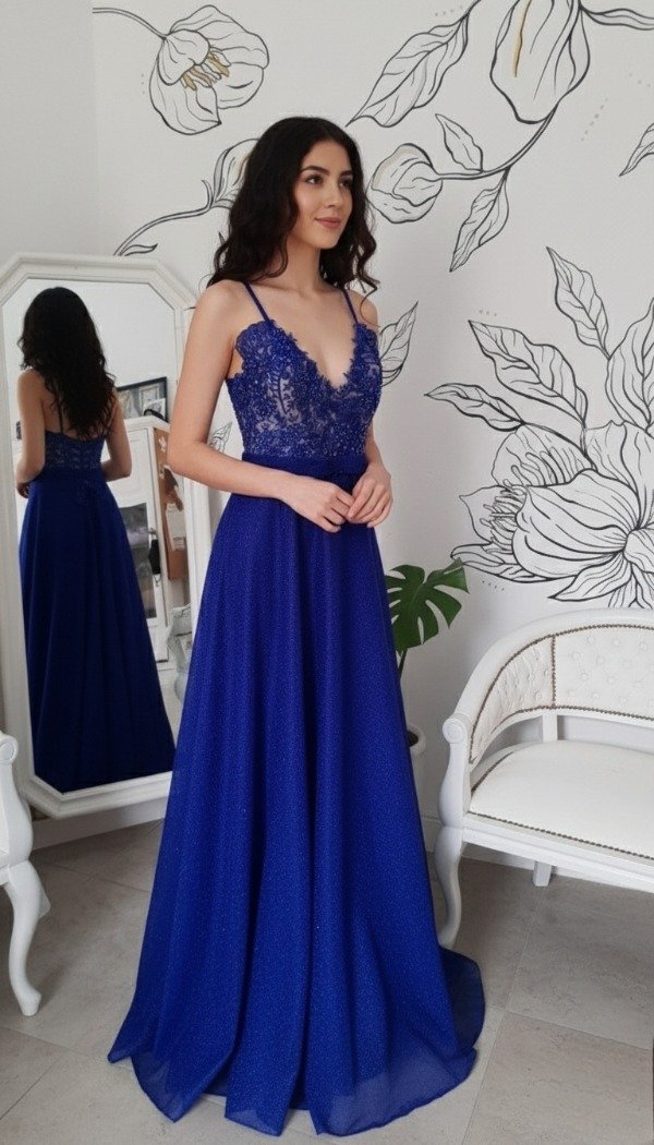 Vestido en lurex con bordado a mano en su parte superior. Cinto rígido de moño.
